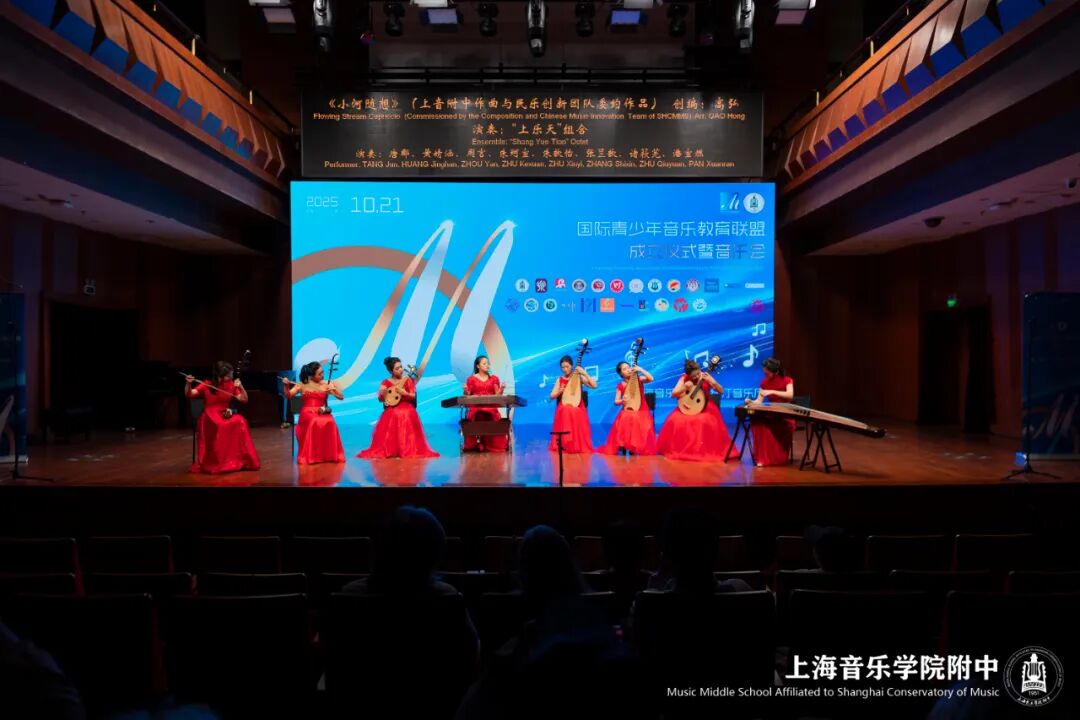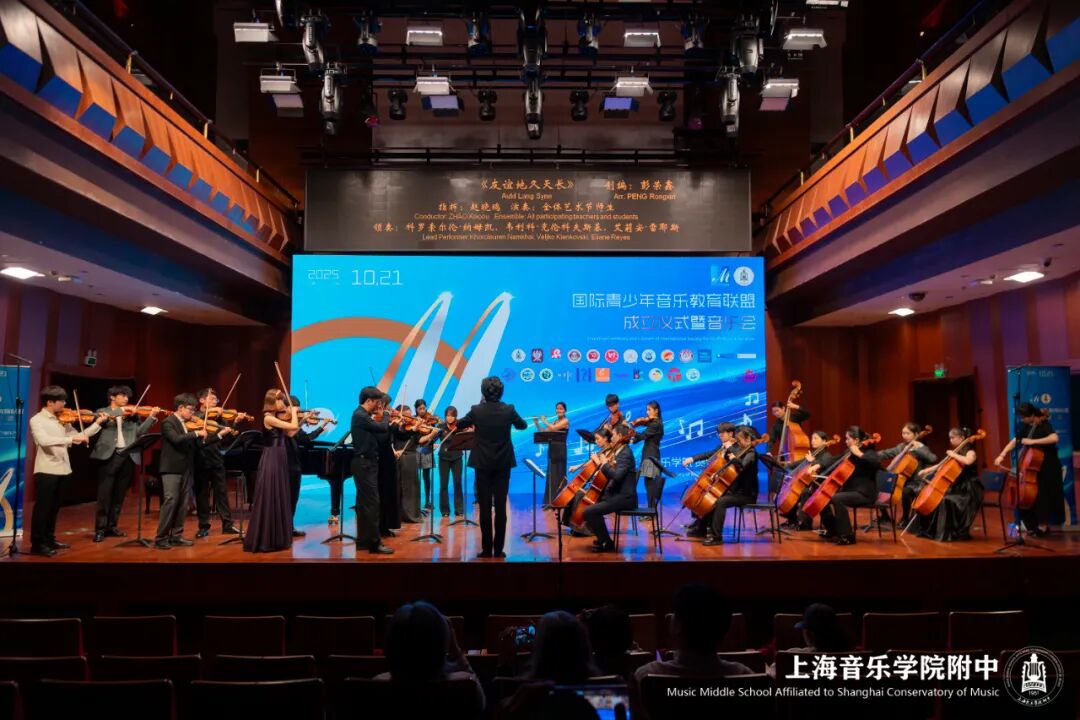 最后,全体师生合奏的《友谊地久天长》(由上音附中彭荣鑫创编、赵晓鸥指挥)深情奏响,象征着联盟成员间的真挚友谊与合作愿景,将整场音乐会推向高潮。