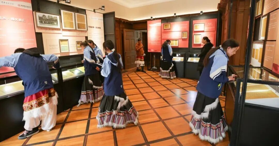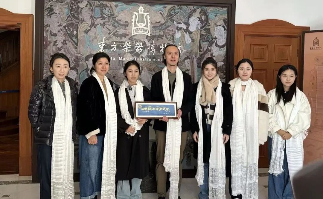 上音援青教师胡骏(左四)和果洛州历史上首位考入上音、现就读于声歌系本科的麻切仁措(左三)向东方乐器博物馆捐赠由果洛州书法协会会长更增撰写的果洛州非物质文化遗产果洛德昂洒智藏文书法作品参观上音校史馆
