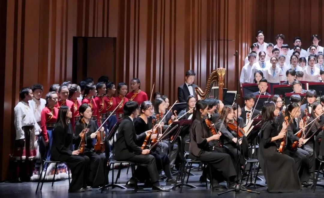 11月27日晚,果洛西宁民族中学的果韵同声合唱团身着民族服饰,登上上海音乐学院建校98周年音乐会舞台,与上海音乐学院合唱团一起,参与由光未然作词、冼星海作曲的大型合唱声乐套曲《黄河大合唱》的演唱,共庆上音建校98周年,赢得现场阵阵掌声。
