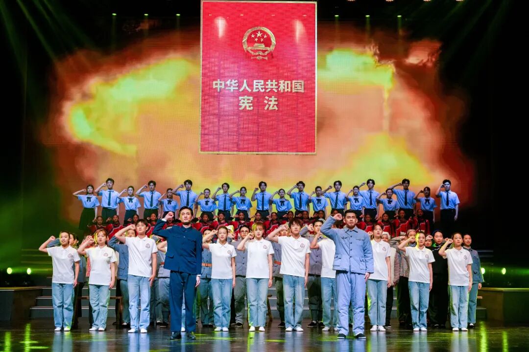 第三篇章“法治筑梦 薪火相传”结尾,音乐戏剧系赵子桢、张凌恺与孩子们共同演绎歌曲《宪法伴我成长》,温暖的歌声与童声交融,生动刻画了宪法如挚友般陪伴青少年成长的画面。