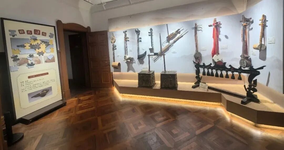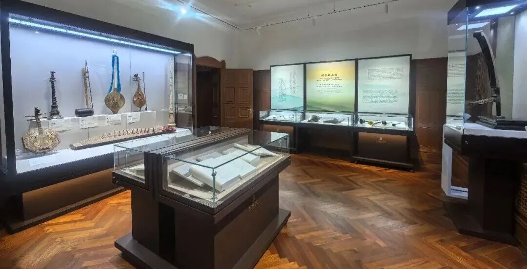 本次展览分为“乐史熠熠 古今相继”“弦歌越海”“制器作乐 传承古今”三大展厅。在“礼乐和鸣”板块,从象征权威秩序的曾侯乙编磬到通达天地、涵养德性的古琴,每件器物都与“礼”的文化精神血脉相连;“节庆共鸣”板块中,傣族象脚鼓、土家族打溜子锣、彝族神鼓等各族锣鼓乐器,共同描绘出“和而不同、共生共荣”的鲜活图景;“多元交响”板块则通过新疆十二木卡姆乐器与西南民族器乐的并置,展现了各民族音乐文化在交流互鉴中形成的“你中有我,我中有你”的文化联结。“弦歌越山河”专题展,呈现了刘英教授团队历经五年深耕的民族器乐研究,这也是上音2021年国家社科基金艺术学重大项目《中国少数民族器乐艺术研究》的重要成果展示。“制器作乐 传承古今”所呈现的乐器集群,是学校在百年发展历程中对“乐器本土化实践”与“传统器乐传承体系建构”领域探索的物质成果。