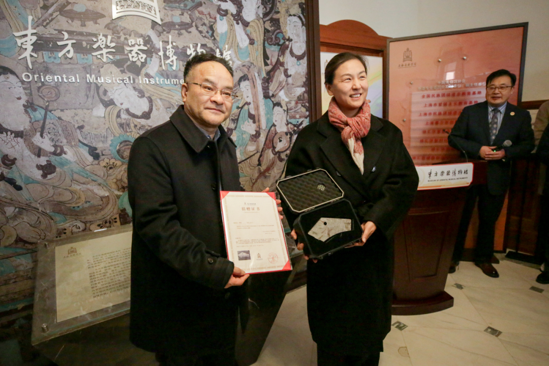 上海科技馆馆长倪闽景向东方乐器博物馆捐赠了珍贵的陨石磬片,上音党委书记裴小倩代表学院接受捐赠。