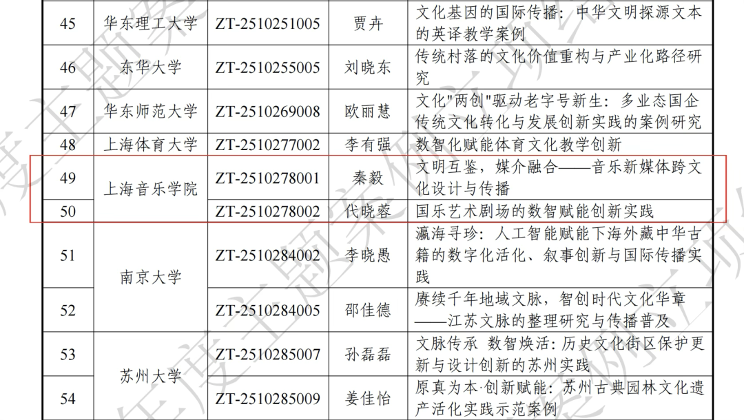 近日,教育部学位与研究生教育发展中心、中国专业学位案例中心公布了2025年主题案例立项名单。由上海音乐学院秦毅副教授申报的《文明互鉴,媒介融合—音乐新媒体跨文化设计与传播》(ZT-2510278001)项目;上海音乐学院代晓蓉教授申报的《国乐艺术剧场的数智赋能创新实践》(ZT-2510278002)项目获批“文化创新”主题立项。