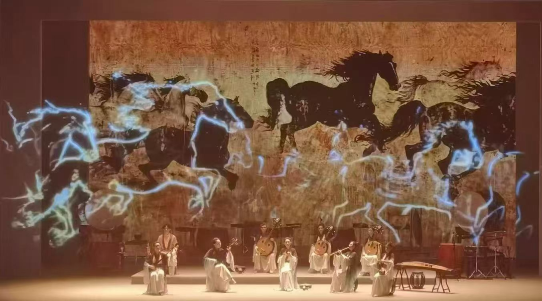 《国乐艺术剧场的数智赋能创新实践》项目依托上海音乐学院“教创演研一体化”人才培养模式,结合原创的艺术实践作品《丝路之乐·唐韵回响》《南韵·国色》,将课程教学与艺术实践紧密结合,形成“理实联动、创制一体”的教学模式。秉持“时尚包装经典,传统走入现代”的主旨,利用数智技术,结合跨界媒体艺术形式,以中华传统文化为根基,探索数字智能协同舞台创制与数字媒体艺术融合的音乐剧场新形式。
