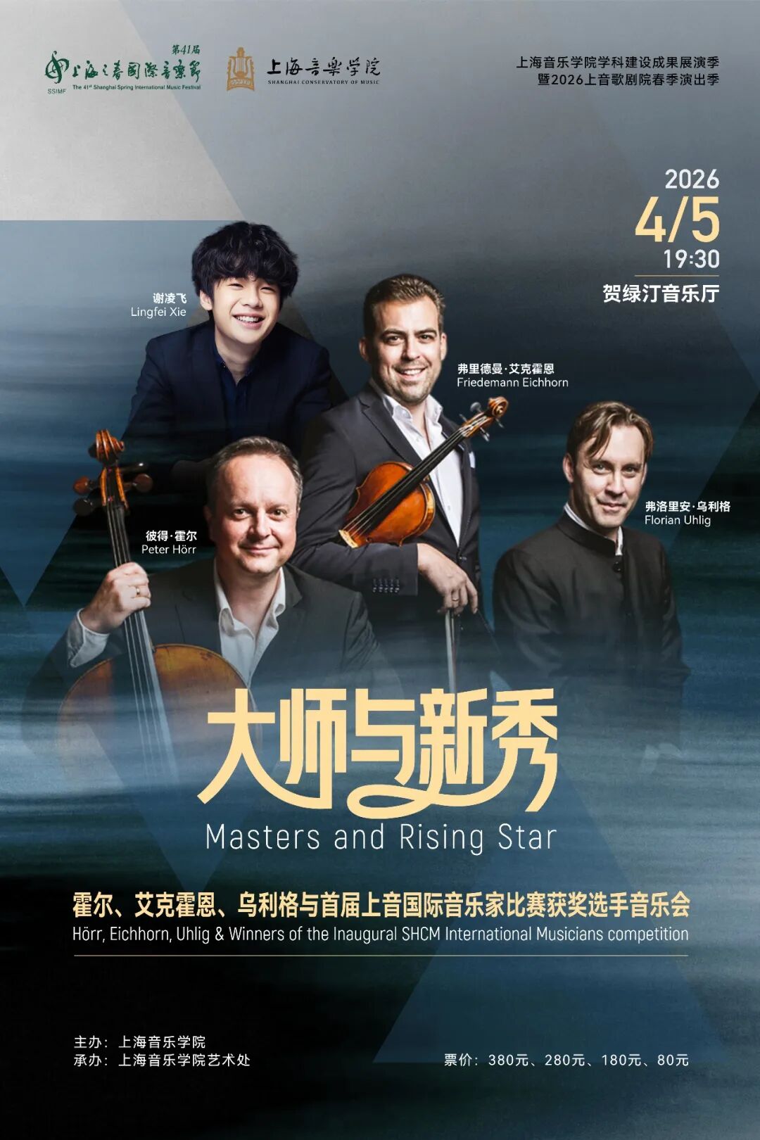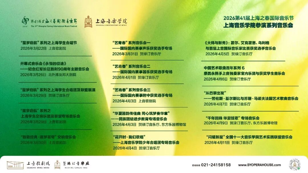 “大师与新秀”音乐会(4月5日)汇聚德国顶尖音乐家与上音国际音乐家比赛获奖选手;“从巴黎出发”法国艺术歌曲音乐会(4月7日)由法国古典乐界权威艺术家联袂献演,沉浸于浪漫意境。
