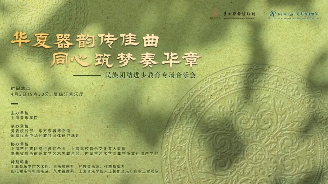 乐韵绕申城,同心筑华章。4月3日晚,由上海音乐学院主办的“华夏器韵传佳曲同心筑梦奏华章——民族团结进步教育专场音乐会”在贺绿汀音乐厅圆满落幕。本场音乐会作为第41届上海之春国际音乐节系列活动之一,以音乐为媒、以艺术为桥,融汇多民族艺术精粹、贯通传统与创新表达,生动诠释“中华民族一家亲”的深厚情谊,为铸牢中华民族共同体意识注入鲜活的文化力量。