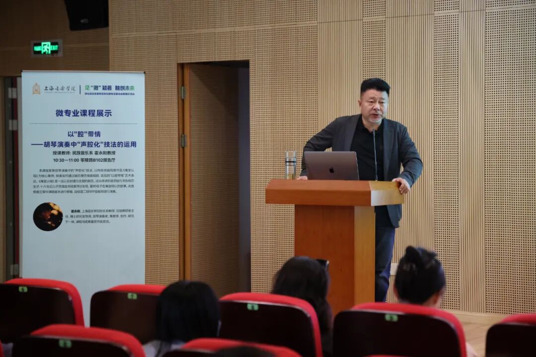 民族音乐系教授霍永刚主讲《以“腔”带情——胡琴演奏中“声腔化”技法的运用》,通过现场示范,展现胡琴模仿人声唱腔的独特艺术表现力。